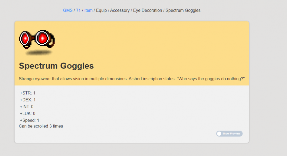 A reminder that spectrum goggles were released in v71 , so that they should be added/enabled in the drop table for the v75 patch. In their current state they're hardly useful for most classes as potential best in slot because they're overshadowed by LPQ's broken glasses (lv 45 , 1 all stat, 20 hp/mp ) . Since spectrum goggles are only obtainable from late game phoenix content ( cwkpq ), a potential change to spectrum goggles could be buffing them so that they're actually useful/viable progression for all classes ( woo cwkpq revival ). Maybe +5 all stats to make up for the loss all stats on the MoN alongside an increase level requirement to 100+. HP / MP could also be added to match or better broken glasses.